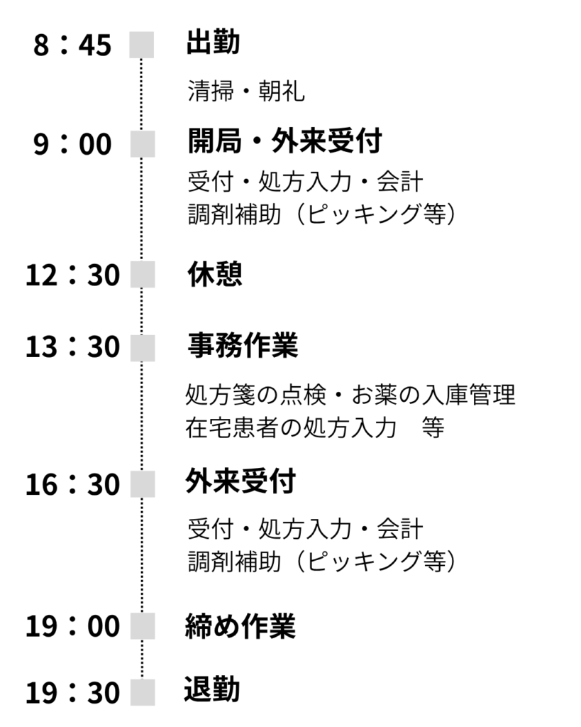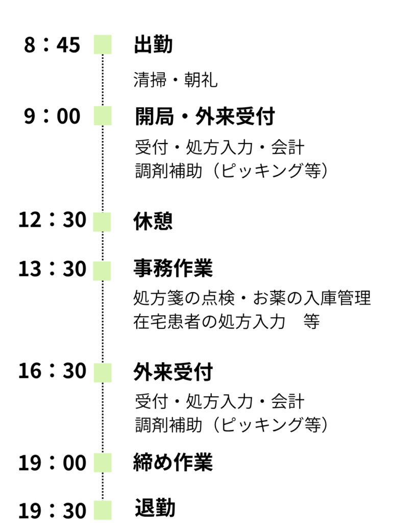 病院では帰りが22時を過ぎることがあり、子育てとの両立が難しかったことで転職を考えた。自宅からも通いやすい距離に薬局があり、募集をしていたことがきっかけ。転職してから子どもの習い事の送迎ができるようになった。早上がりの日もあるため、家庭との両立を図れています。